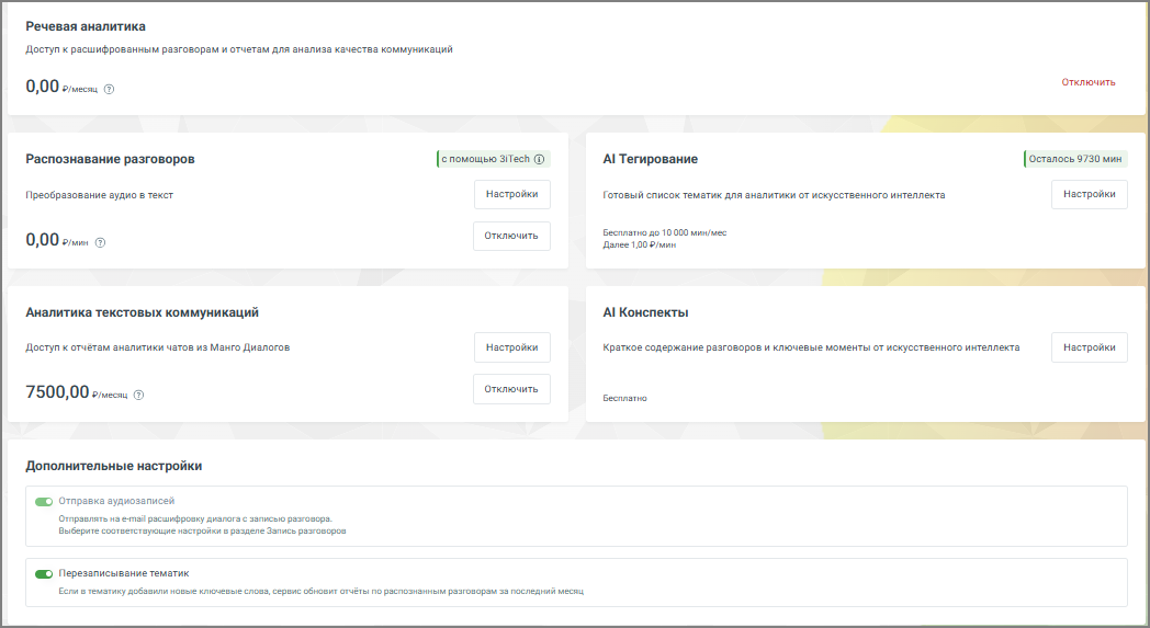 Распознавание разговоров – отображается стоимость расшифровки и распознавания аудиозаписей разговоров. В настройках можно настроить условия распознавания аудиозаписей разговоров. Пользователь может отправлять на распознавание только нужные звонки.