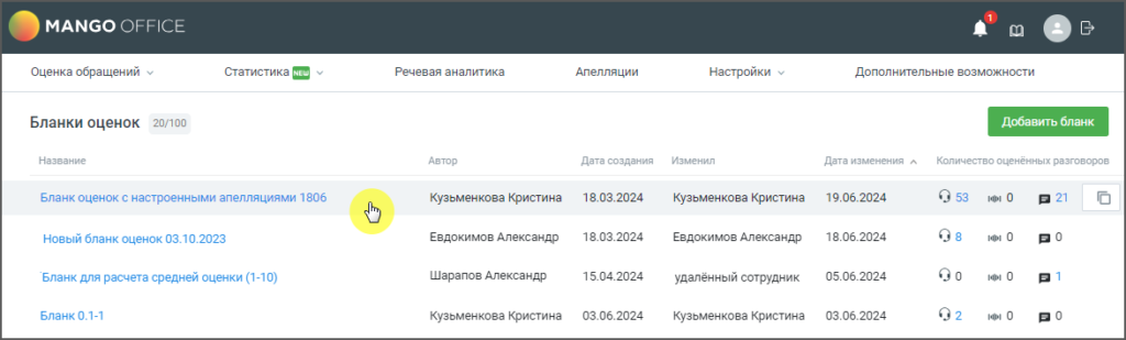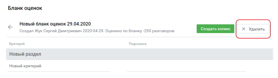Если в созданном ранее бланке не были выставлены (сохранены) оценки ни по одному разговору, то критерии и разделы бланка можно добавлять, удалять или переименовывать.