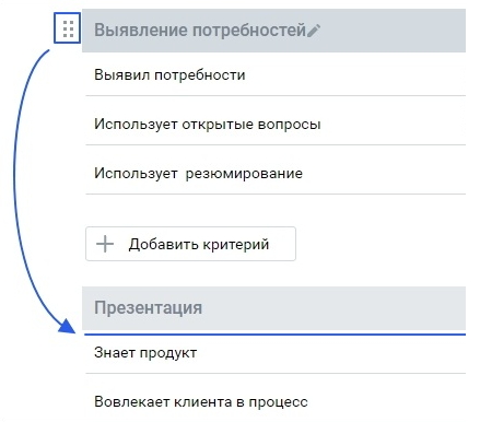Для перемещения раздела на другую позицию установите курсор на пиктограмме , и, удерживая левую кнопку мыши в нажатом состоянии, переместите раздел выше или ниже по списку. При изменении позиции раздела все критерии и подсказки внутри раздела перемещаются вместе с ним.