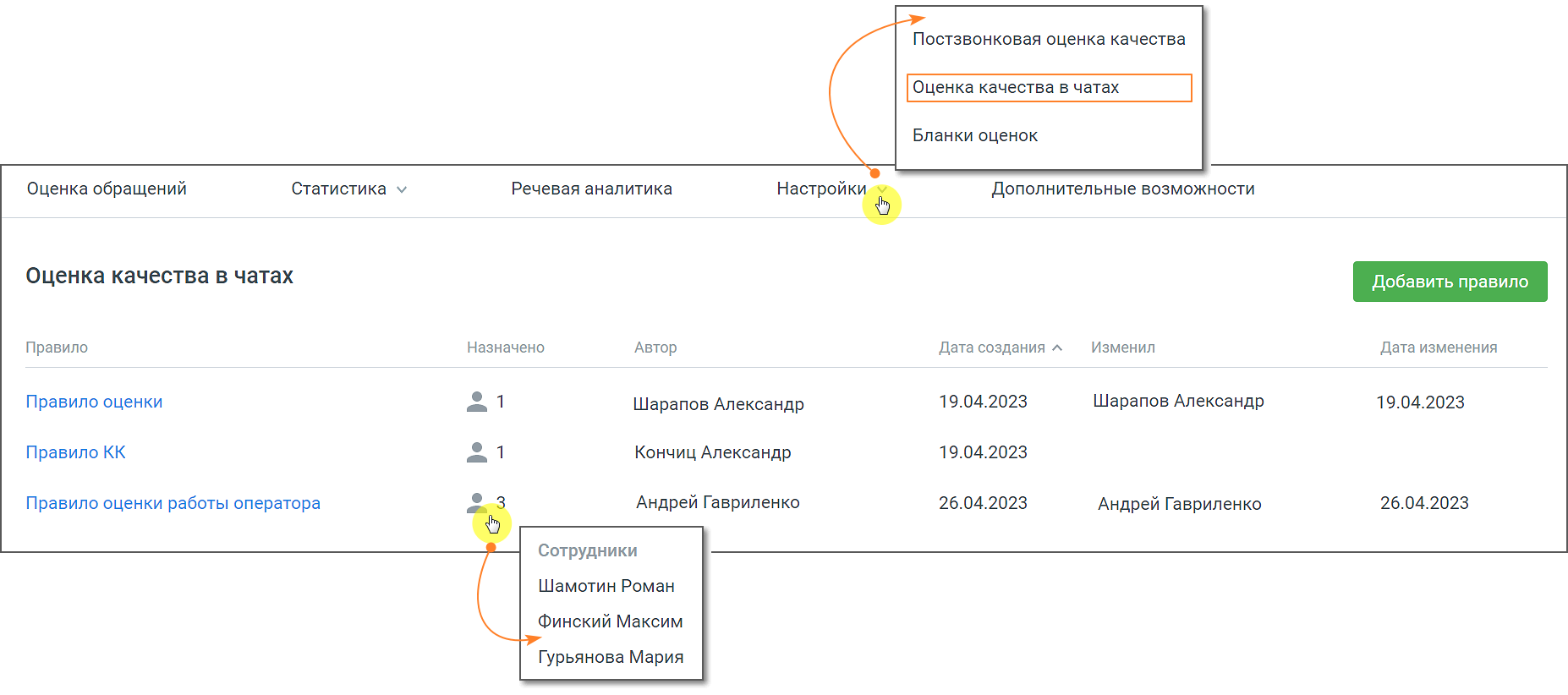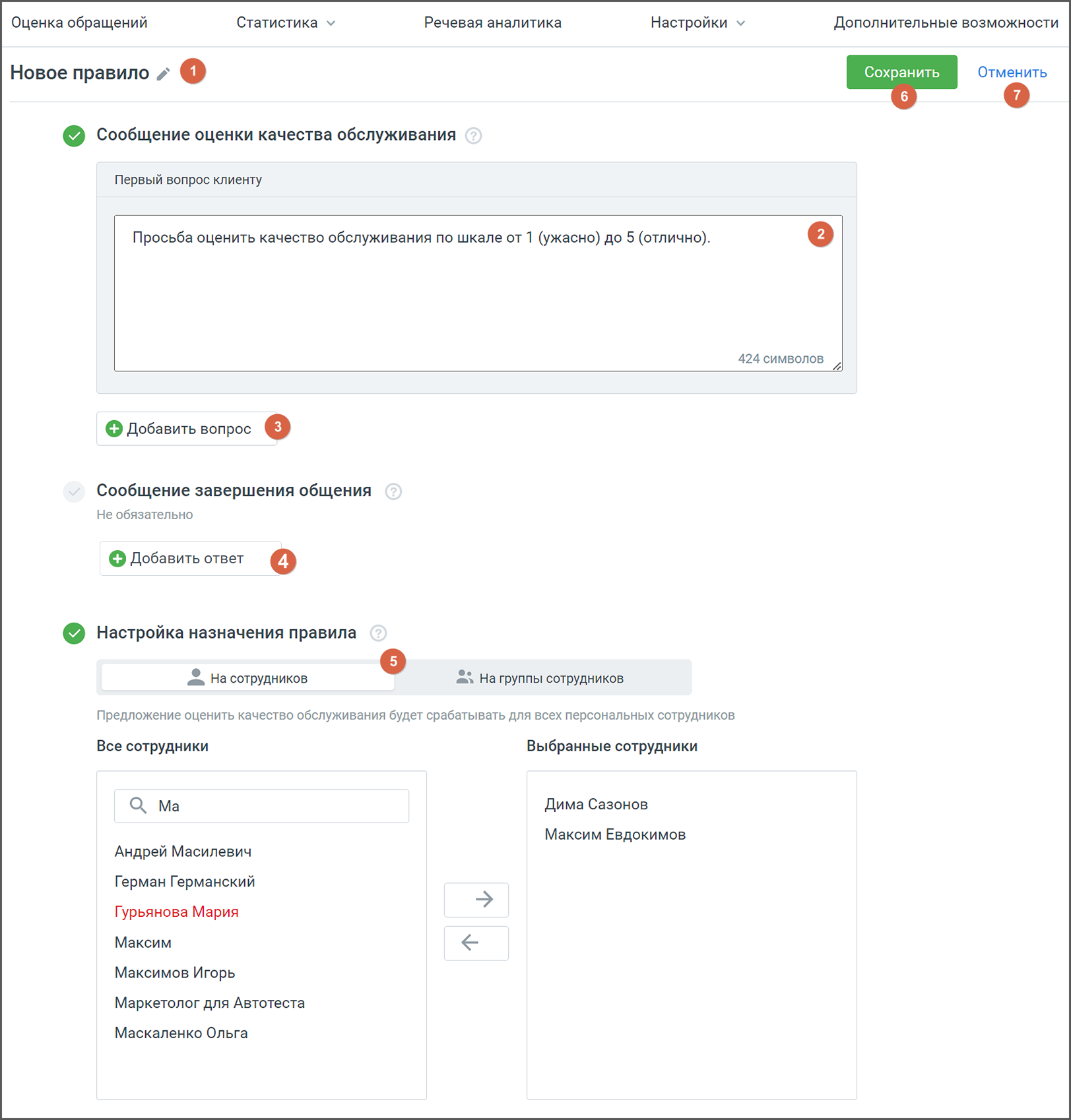 - Назначено – сотрудники или группы, которым было назначено данное правило. Вопросы, содержащиеся в правиле, будут заданы клиенту после завершения разговора с указанными сотрудниками или группами;