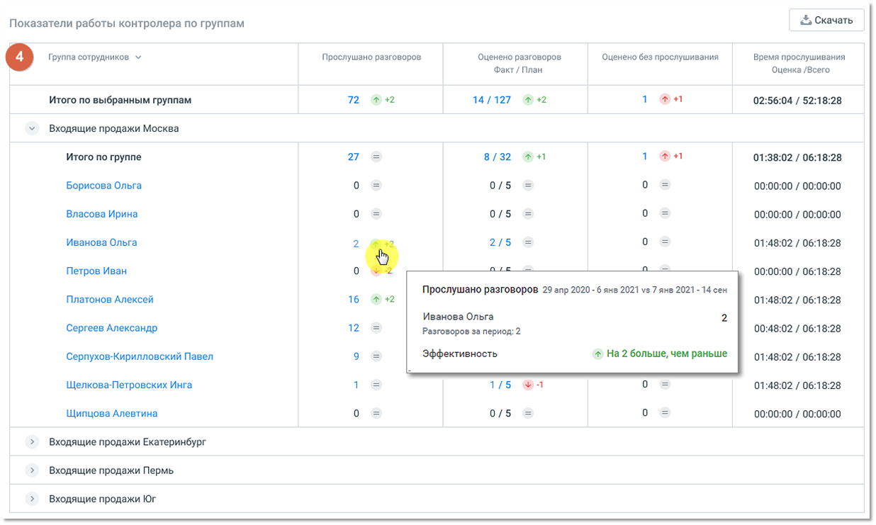 Стрелки «вверх» и «вниз» показывают рост или снижение количества прослушанных и/или оцененных разговоров за выбранный период времени.