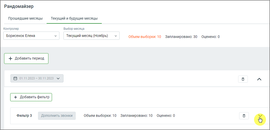 Для начала отбора звонков необходимо выбрать контролера, а также один или несколько периодов, в которых будет производиться отбор. Каждый период по умолчанию составляет один календарный месяц. Допустимый диапазон выбора – прошедший и будущий год, считая от текущего месяца. Для каждого периода можно задать один или несколько наборов фильтров отбора.