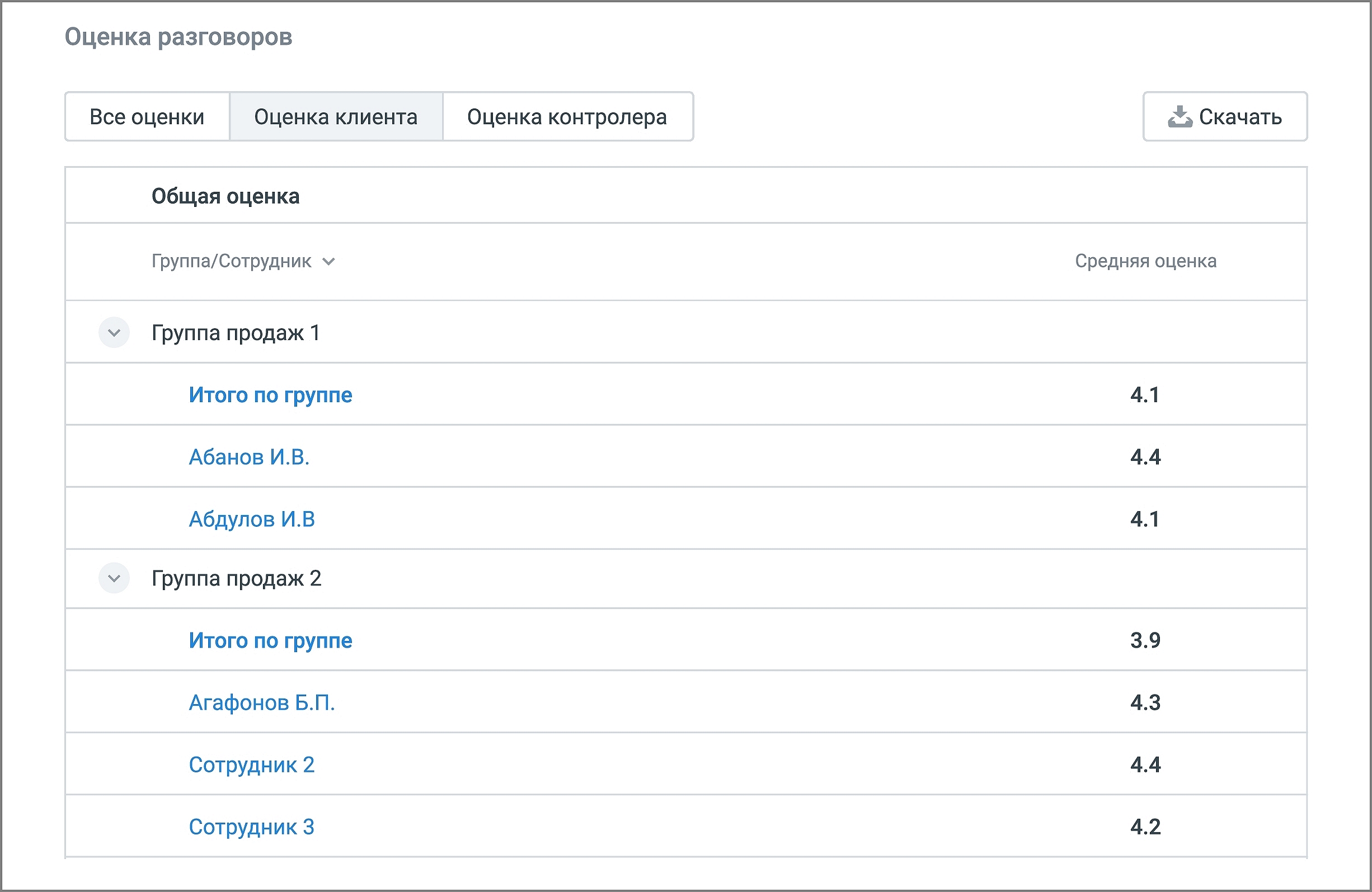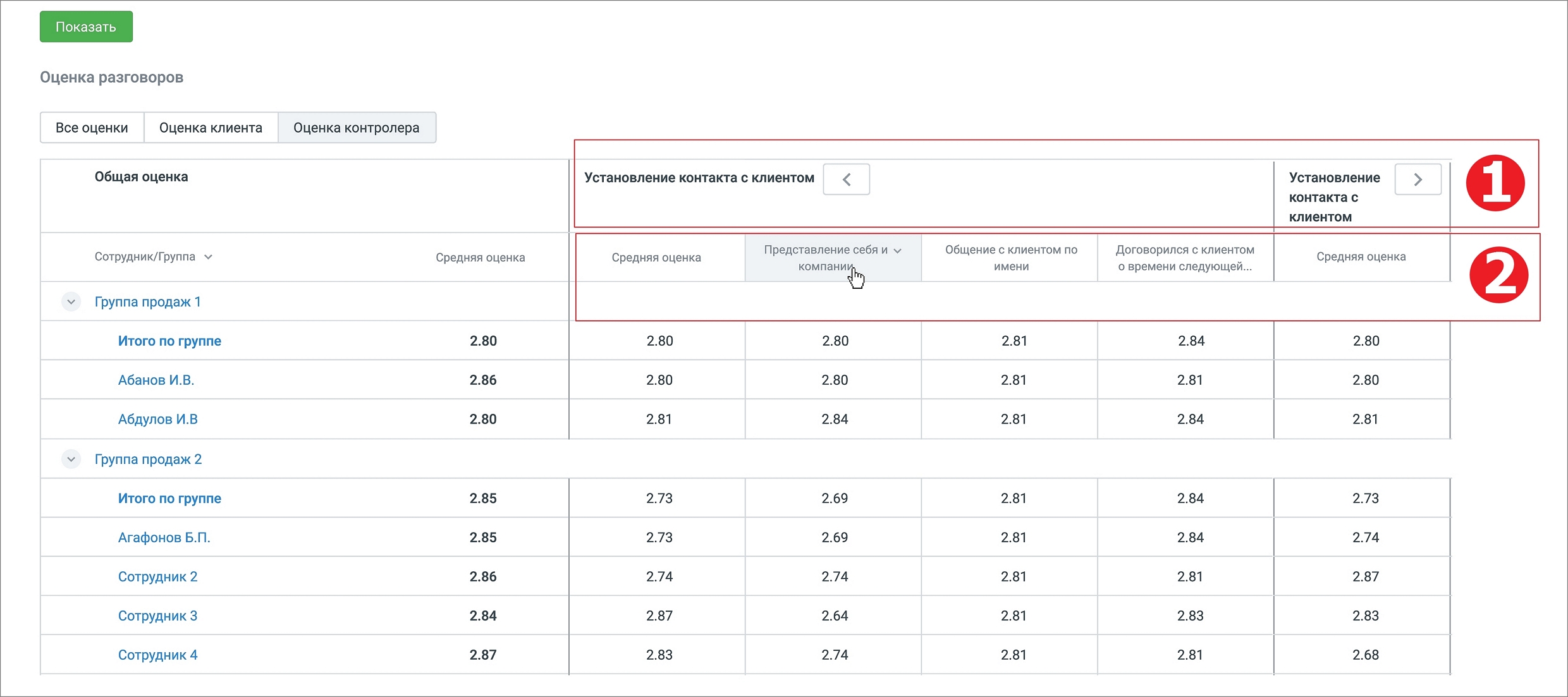 • средняя оценка – средняя оценка клиента/контролера разговоров сотрудников;