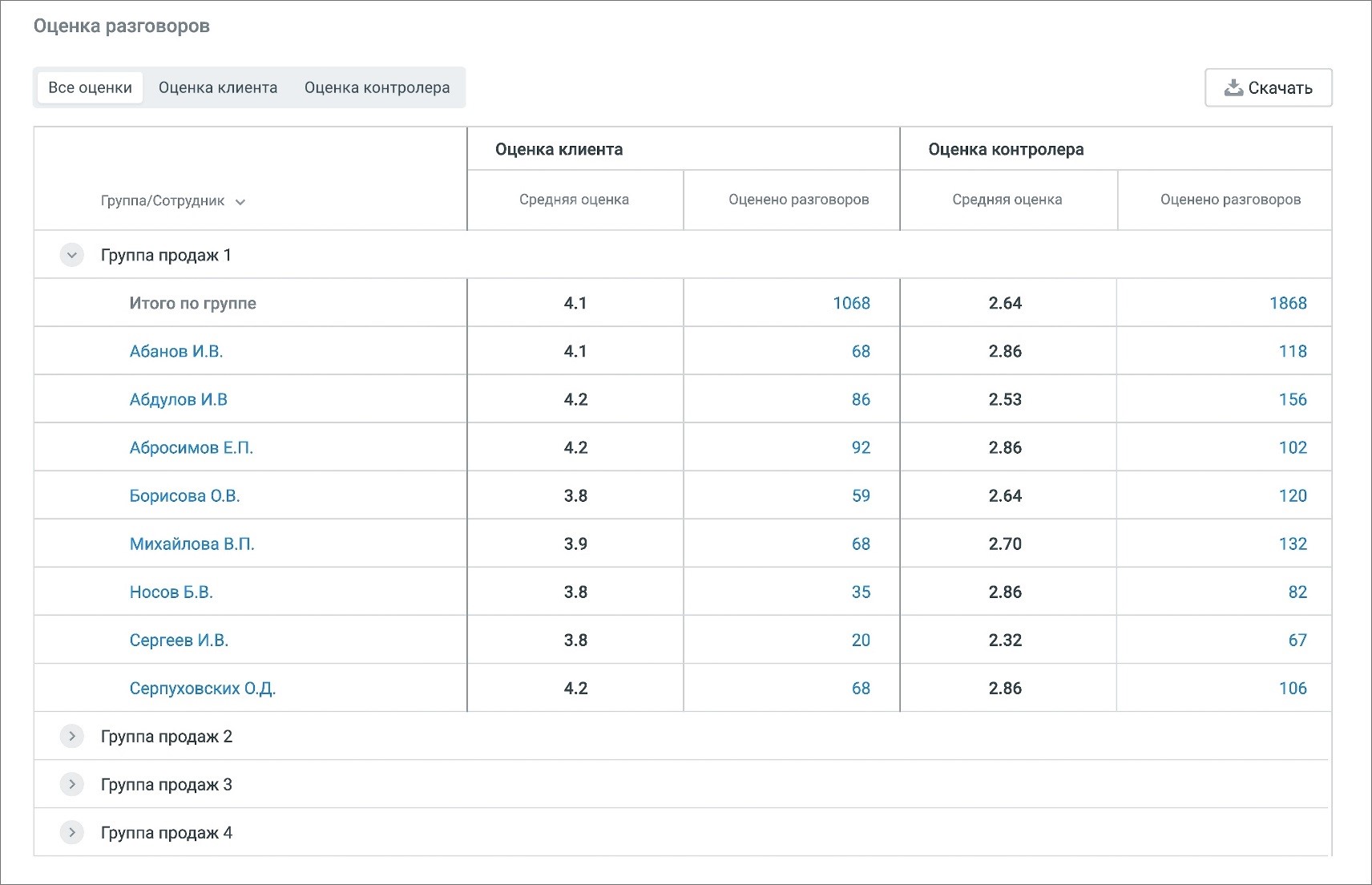 • оценено разговоров – количество оцененных клиентом/контролером разговоров сотрудников.